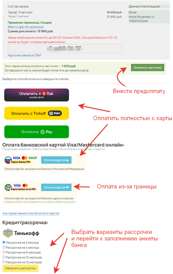 Для внесения предоплаты нажмите на кнопку "оплата картой", далее "частичная оплата", для полной оплаты - "оплата картой", для оплаты в рассрочку нажмите на кнопку "беру в рассрочку" и заполните анкету для банка.
